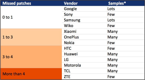 Mit Android 6.0 führte Google monatliche Patches ein, um neu entdeckte Sicherheitslücken schnell schließen zu können. Zahlreiche Hersteller verteilen dabei offenbar „leere Patches“ oder aktualisieren nur das Datum der Sicherheitsebene, ohne dabei Lücken zu stopfen. Auf den untersuchten Geräten fanden die Forscher so offene Sicherheitslecks, die laut den Angaben der Hersteller eigentlich längst per Update geschlossen waren. Auch die Software selbst gab in diesen Fällen an, auf dem neuesten Stand zu sein. Betroffen sind dabei große Firmen wie Samsung oder Sony, allerdings trat das Problem hier nur vereinzelt auf. Deutlich gravierender war das Ausmaß bei Geräten von ZTE oder TCL, wo im Schnitt mindestens vier Sicherheitslücken vorhanden waren, die eigentlich als bereits geschlossen gemeldet wurden.