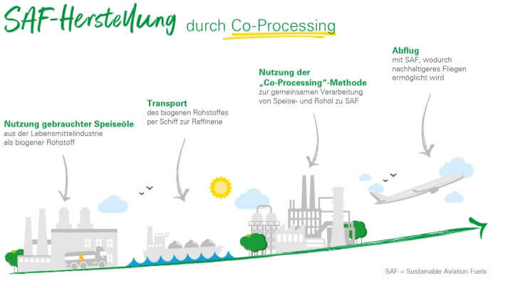 Die verwendeten Fette und Öle werden in einem geschlossenen Verfahren bis zum zulässigen Anteil von fünf Prozent mit den Rohöl-Kohlenwasserstoffen für das herkömmliche Kerosin kombiniert. Bei der späteren Verbrennung ist der CO2-Ausstoß des Bio-Kerosins zwar ähnlich hoch wie der des rein fossilen Flugbenzins. Weil aber die Fettkomponenten schon zuvor im Stoffkreislauf waren, soll die Gesamt-Klimabilanz besser sein.