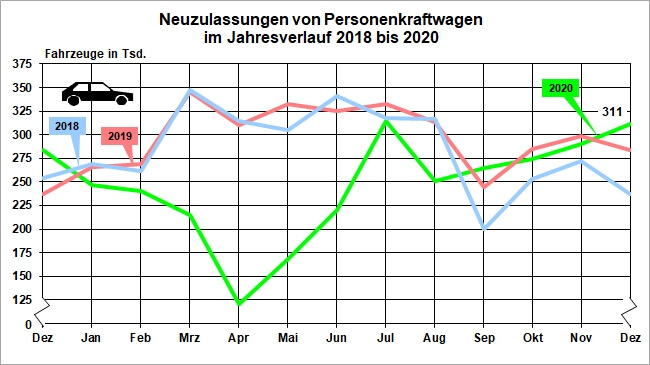 Über das Jahr hinweg gesehen, erlitten aber mit Ausnahme von Tesla und dem italienischen Autobauer Fiat fast alle großen Hersteller einen Absatzeinbruch. Zu den größten Verlierern gehören Opel und Ford mit einem Minus von jeweils mehr als 30 Prozent. Heftig erwischte es auch Dacia, Mazda, Smart, Suzuki und Volkswagen. Die Wolfsburger konnten rund ein Fünftel weniger Autos als im Vorjahr absetzten. Nicht ganz so starke Verluste hinnehmen mussten Mercedes, BMW, Mini, Jeep, Kia oder Lexus. Auch die Neuzulassungen von Nutzfahrzeugen gingen im vergangenen Jahr zurück. So wurden nach Angaben des Kraftfahrt-Bundesamtes rund 295.000 Lastwagen neu angemeldet. Dies sind gut 14 Prozent weniger als 2019. Ganz anders bei Motorrädern: Hier stieg die Zahl der Neuanmeldungen um etwa ein Drittel auf 222.000 Stück.