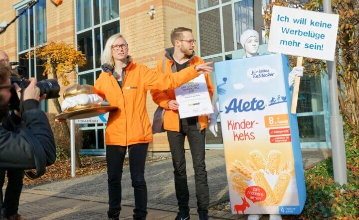 Dem Hersteller des Produkts mit den meisten Stimmen will Foodwatch den Negativpreis am Firmensitz überreichen – angenommen hat ihn bislang jedoch noch kein Unternehmen. Im vergangenen Jahr wählten die Verbraucher den „babygerechten“ Kinderkeks von Alete zur „Werbelüge des Jahres“.