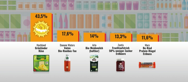 Der auf dem 2. Platz gelandete Roiboos Tee von Danone Waters enthält nach Angaben von Foodwatch gerade einmal 0,26 Prozent Roiboos-Aufguss und 92 Prozent aromatisiertes Mineralwasser. Die rötliche Farbe komme vor allem von einer entsprechend eingefärbten Verpackung. Die Groß-Molkerei Arla hingegen bewirbt ihre Bio-Weidemilch mit einem Siegel, das 71 Prozent weniger CO2 verspricht. Dabei unterschlägt der Konzern laut Foodwatch allerdings den wichtigsten Punkt der Klimabilanz: die Milchproduktion. Die Werbeaussage bezieht sich so lediglich auf die Verpackung.